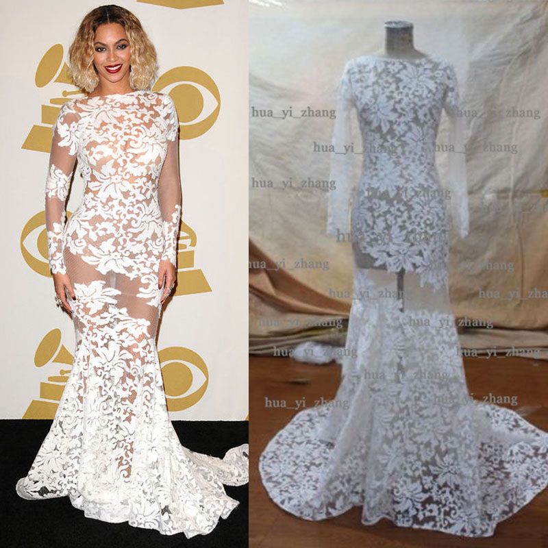2015 Beyonce Dresses Sheer Celebrity Gowns Sheer Long Sleeve Crew Mermaid Court Train Evening Red Carpet Dresses Real Images