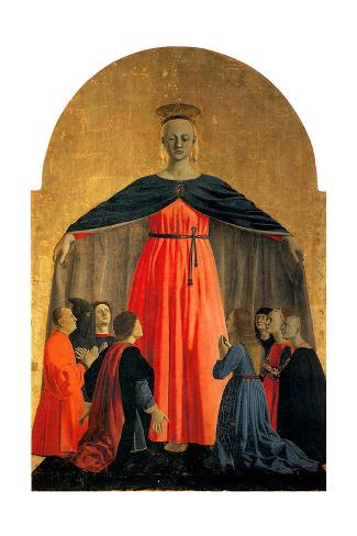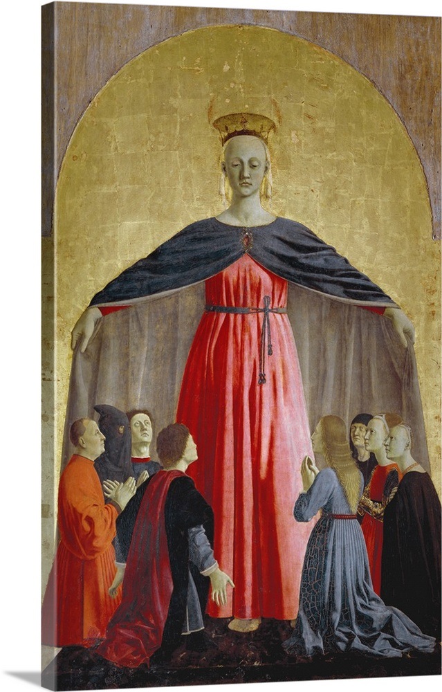 Nevertheless in the most famous example the madonna della misericordia altarpiece 14451462 in sansepolcro by piero della francesca the subject is the central panel of a large altarpiece with a smaller crucifixion above it and many other panels. Il polittico della misericordia di sansepolcro. The polyptych of the misericordia is a painting conserved in the museo civico di sansepolcro in the town of sansepolcro region of tuscany italythe painting is one of the earliest works of the italian renaissance painter piero della francesca who was born in the townthe central panel is of the common motif of the virgin of mercy or madonna della misericordia.