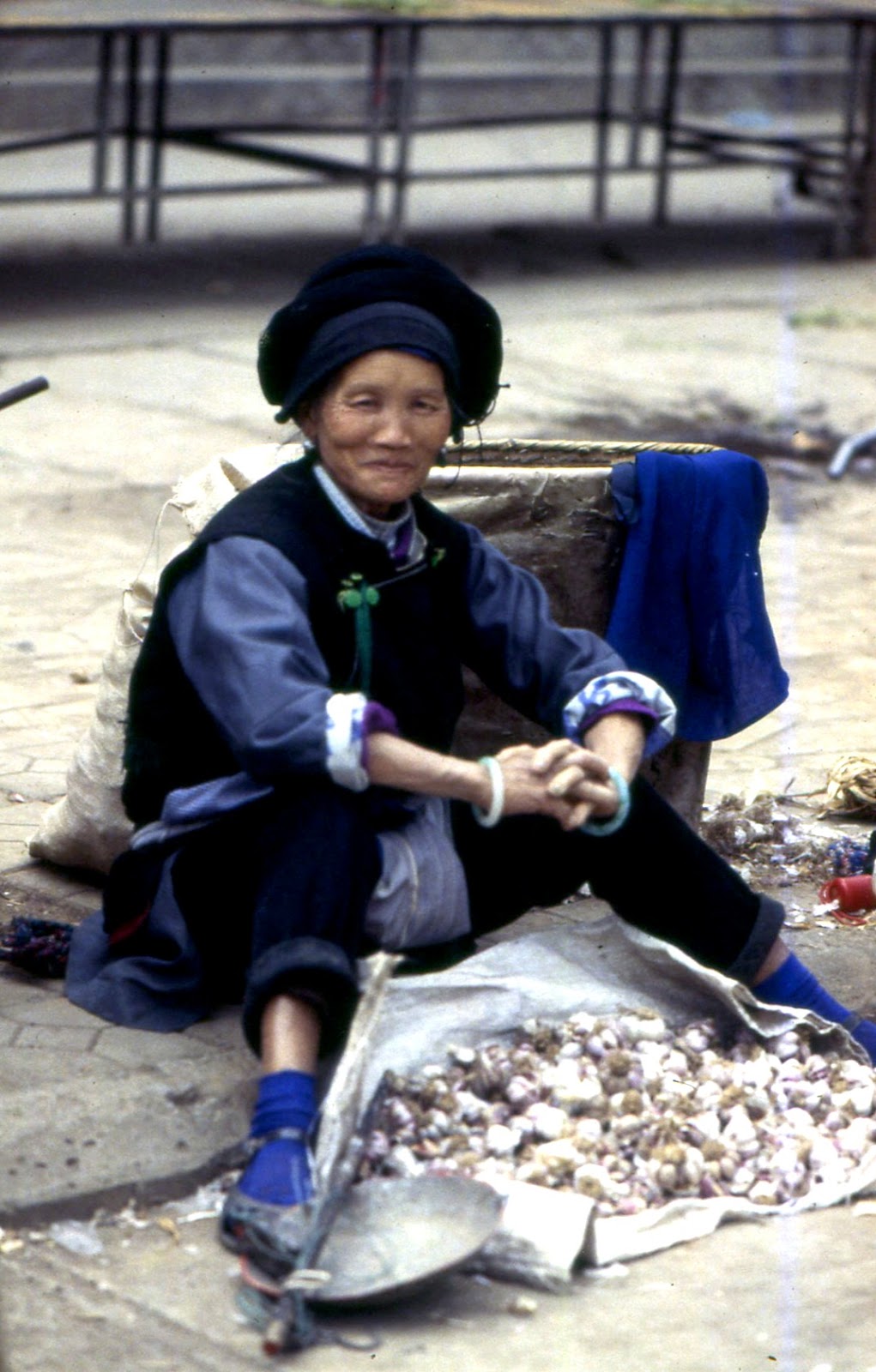 The most colorful people in the city were women of the White Yi minority, from Liuhe Autonomous Yi District in the mountains east of Songgui. Their distinctive clothing item was a calf-length, long-sleeved tunic, in various shades of blue with contrasting bands on the sleeves. It split at the waist, with a thin strip hanging down in front and the wider part draped over the back of the hips. They wore ordinary blouse and trousers underneath and a wide, multi-colored sash belt wrapped several times around the waist. On their heads they wore a black bonnet that hung over the back of the neck, with colored trimming on the brim.